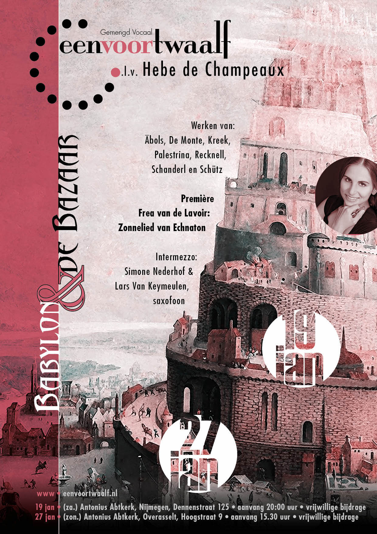 Het kleine koor Eenvoortwaalf neemt u deze keer mee op reis door de Levant. Zoals altijd is de programmering avontuurlijk en een mix van oude en hedendaagse muziek. Farao’s komen ten tonele in psalmen en zonneliederen. Babylonische schoonheid klinkt in de werken van Schütz, De Monte en Palestrina. Extra feestelijk is de première van ‘Zonnelied van Echnaton’ van componiste Frea van de Lavoir. Zij laat de schoonheid en kracht van de zon weerklinken, op tekst van Bertus Aafjes. Tot slot vertoeft u met ‘Bazar’ op een moderne markt, met alle geluiden van dien. Gastdirigent is Hebe de Champeaux. Toegang is een vrijwillige bijdrage en een drankje na afloop.