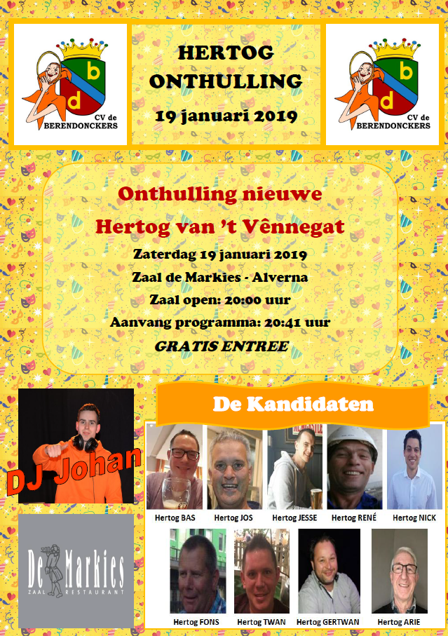 Op zaterdag 19 januari zal in Zaal de Markies op Alverna de nieuwe Hertog van ’t Vênnegat worden onthuld tijdens de jaarlijkse Hertogonthulling van carnavalsvereniging de Berendonckers. Ook dit jaar zijn 9 kandidaten gestrikt, waarvan er uiteindelijk 1 overblijft die Hertog Melchior opvolgt en komend jaar over ’t Vênnegat, zoals Alverna in carnavalstijd heet, zal heersen.