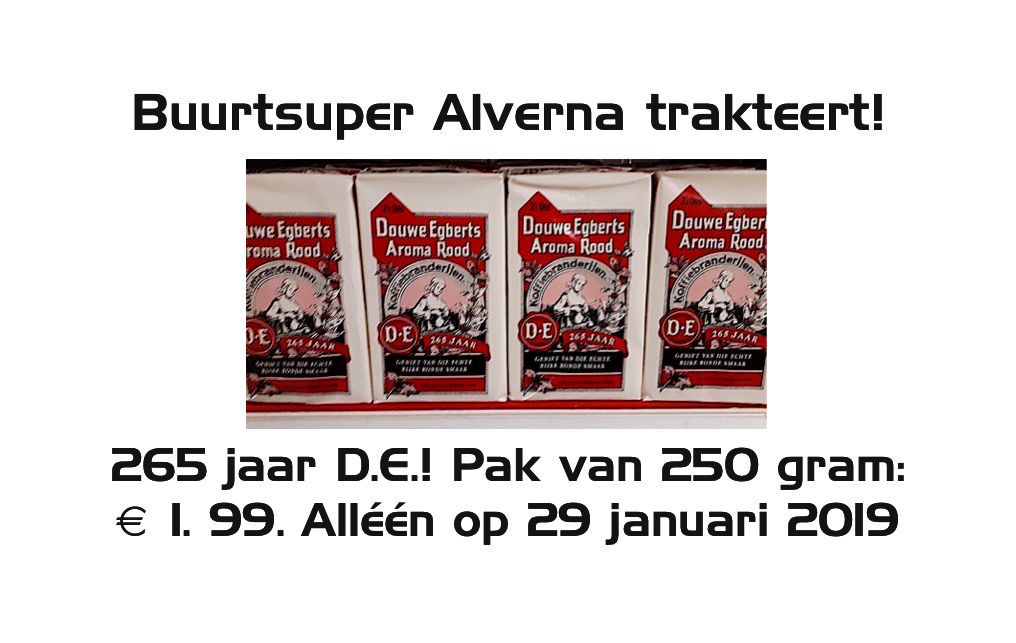 Buurtsuper Alverna aan de Heumenseweg 8 in Alverna/Wijchen (tel. 024-642 5121) trakteert vanwege 265 jaar Douwe Egberts: alléén op dinsdag 29 januari: €1,99 voor een pak DE-koffie van 250 gram.