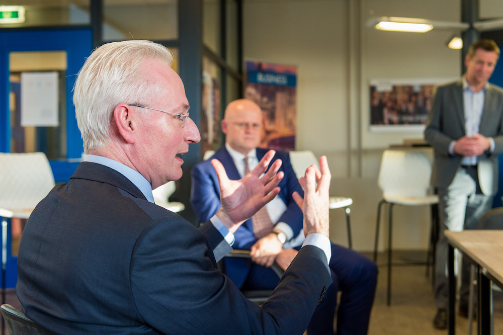Na het bezoek aan de aula ging de minister een uur in discussie met zo’n 40 vwo-leerlingen. Ook de burgemeester van Wijchen (Hans Verheijen) en de burgemeester van Beuningen (Daphne Bergman) namen deel aan deze discussie. De leerlingen hadden stellingen voorbereid over het beslissend referendum, de legalisering van softdrugs en privacy versus terrorismebestrijding. Zo ontstond er ook een discussie over appen op de fiets. ‘Moet daar straks niet meer op gecontroleerd worden dan nu gebeurt met fietsverlichting', vroeg één van de leerlingen zich af. ‘Daar moet zeker steekproefsgewijs op gecontroleerd worden', aldus de burgemeesters. Het slotwoord van de minister: ‘Heel goed dat jullie mij hebben uitgenodigd. Blijf altijd doorvragen, dat is mijn belangrijkste advies!'