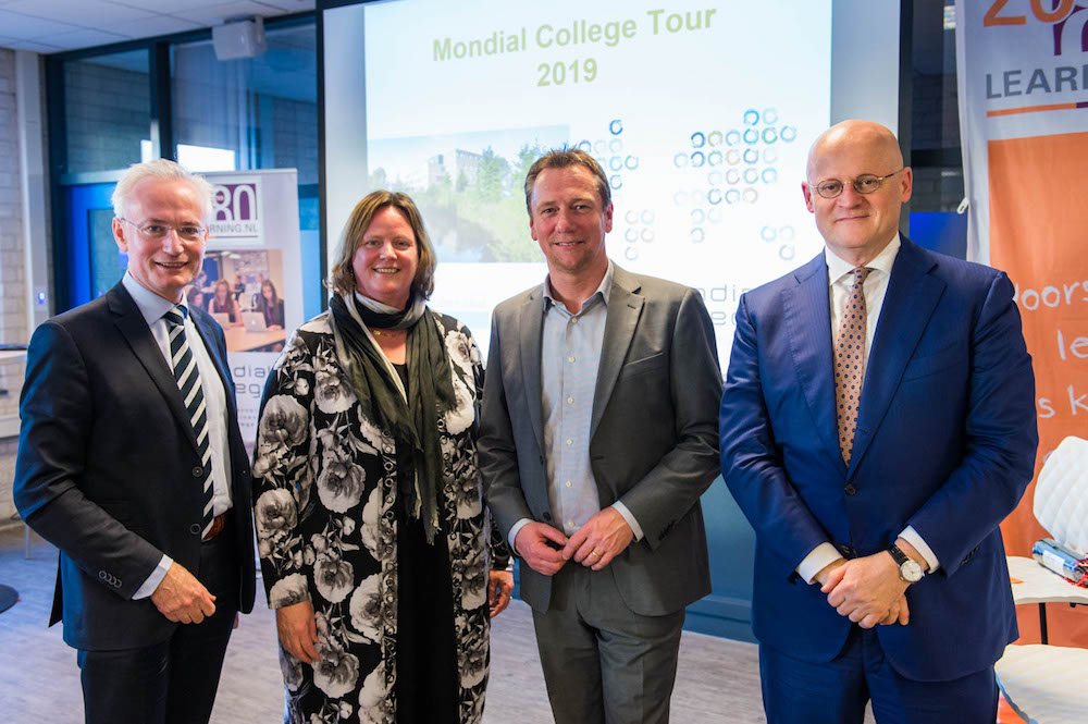 V.l.n.r.: Hans Verheijen (burgemeester Wijchen), Daphne Bergman (burgemeester Beuningen), Gert-Jan Jansen (rector Mondial College) en minister Grapperhaus.