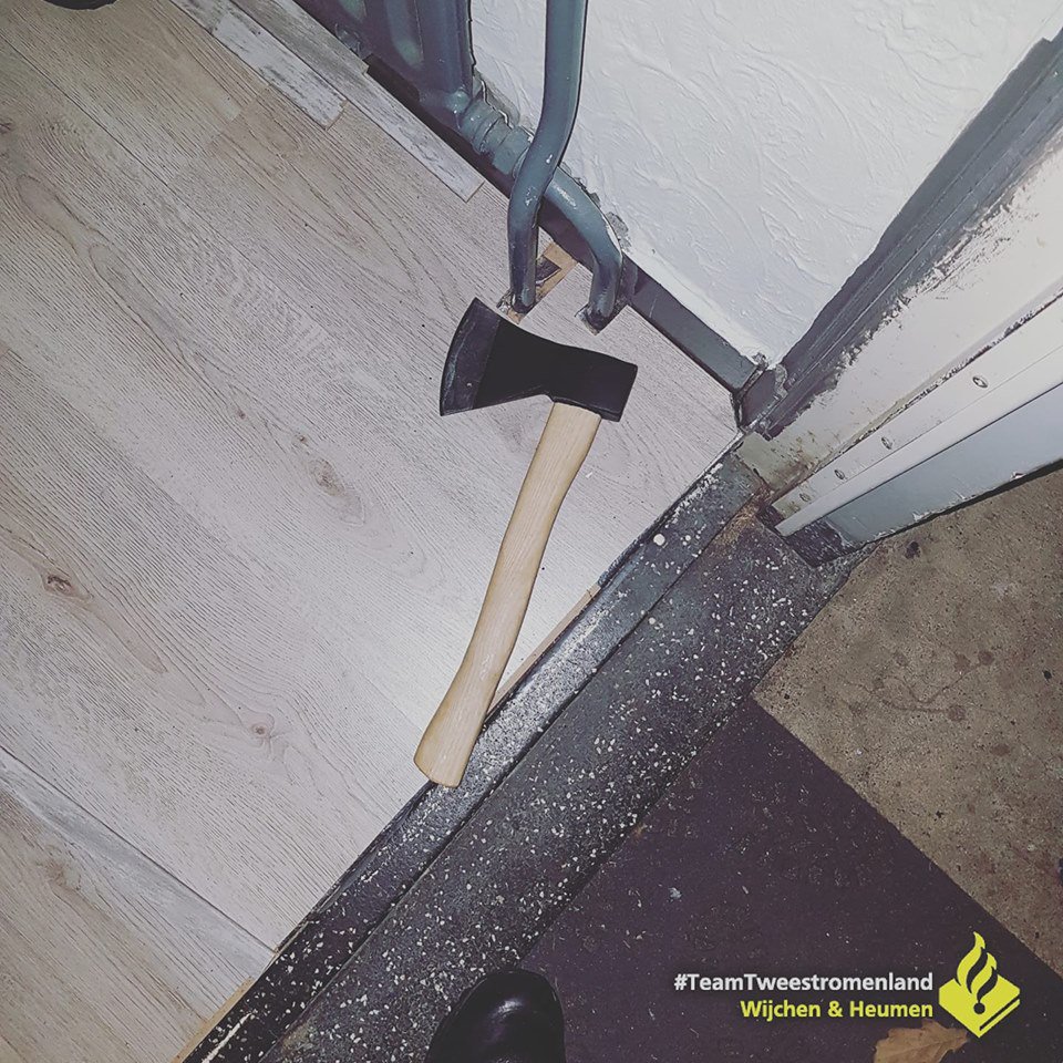 Facebookpagina: "Afgelopen weekend zijn wij met diverse eenheden ter plaatse gegaan na een melding van een bedreiging met een bijl in Wijchen. Ter plaatse bleek de dader zijn woning te zijn ingelopen. Nadat hij in eerste instantie niet reageerde op aanbellen en bonzen, kwam hij naar buiten lopen met een hand en voorwerp achter zijn lichaam. Aangezien er mogelijk sprake was van een bijl en de man weigerde zijn handen te laten zien namen collega’s hun vuurwapen ter hand, waarbij het wapen naar de grond gericht werd. Hierop liet de man daadwerkelijk een bijl vallen. De 39-jarige man is aangehouden en voor onderzoek overgebracht naar het politiebureau in Nijmegen."