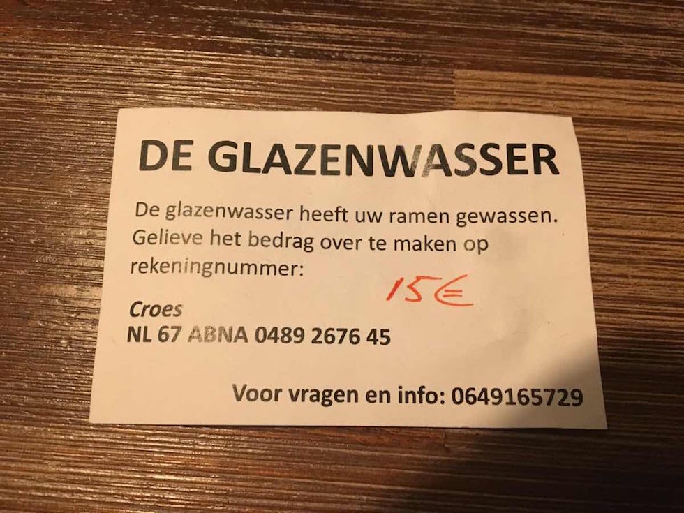 VVD-raadslid Roel Boumans waarschuwt via Twitter: "Volgens buurt-app is er een glazenwasser actief in Wijchen die ongevraagd je glazen wast en dan een rekening in je bus gooit. Opletten dus."