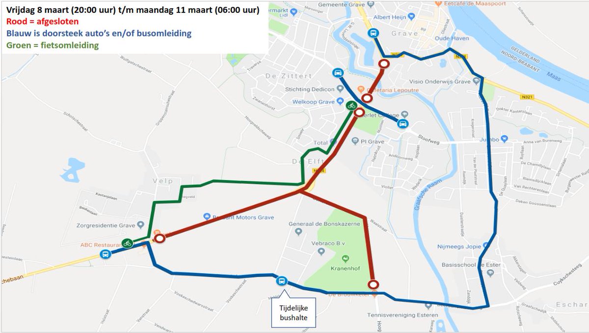 De provincie werkt aan de N324 van knooppunt Paalgraven bij Ecoduct Maashorst tot aan de brug over de Maas bij Grave. Van vrijdag 8 maart 20.00 uur tot maandag 11 maart 06.00 uur sluit BAM de nieuwe rotonde bij de Generaal de Bonsweg aan op de Bosschebaan en Elftweg. Daarom sluiten zij deze weg, de kruising en de Steegschenhofscheweg af. Er komt dan nieuw asfalt op de kruising. De Kranenhofscheweg (bij de voetbalvelden) is tijdelijk geopend voor doorgaand verkeer.