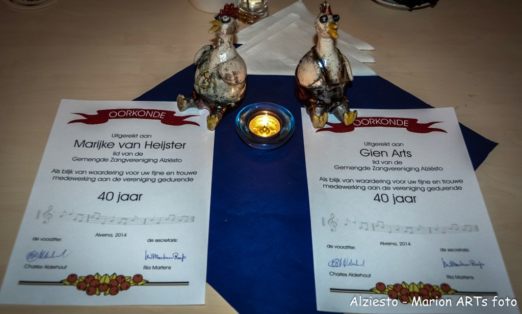 Gien Arts en Marijke van Heijster zijn beiden al 40 jaar trouw aan het zingen bij Gemengde Zangvereniging Alziësto in Alverna.