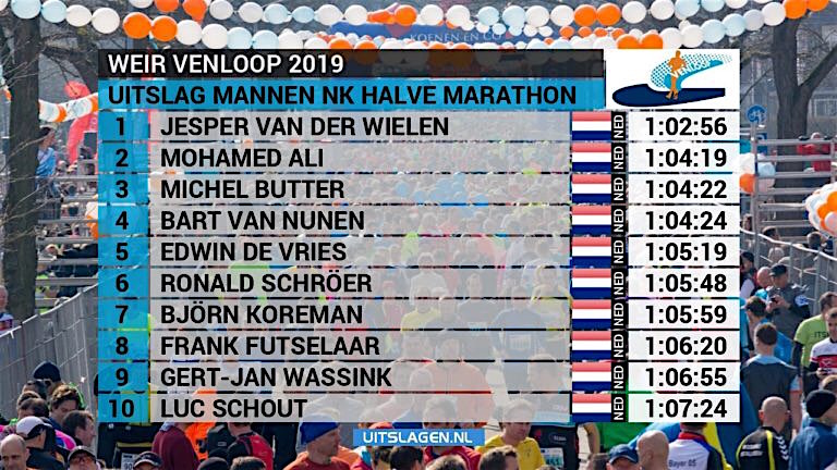 Bij de mannen liet Jesper van der Wielen er op zondag 31 maart tijdens de Weir Venloop - het Nederlands Kampioenschap Halve Marathon in Venlo - geen gras over groeien. Hij startte hard en liep al snel weg van de concurrentie. Hij kon in het tweede deel van de race goed samenwerken met twee buitenlandse lopers en wist als eerste te finishen in een toptijd van onder de 63 minuten. Met 1.02.56 liep de geboren Wijchenaar tevens een persoonlijk record. Proficiat Jesper!