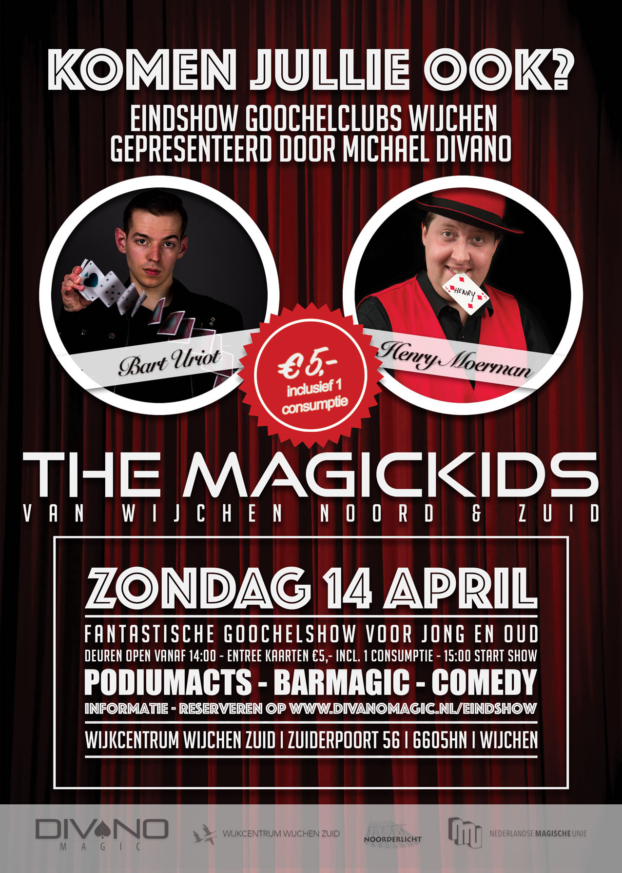 De locatie van de eindshow is in het wijkcentrum Wijchen-Zuid. De zaal zal om 14:00 uur opengaan voor het publiek. Voor, tijdens (in de pauze) en na de eindshow gaan de magickids, onder leiding van Magic Melvin, u vermaken met kleine goocheltrucs die ze op de vierkante centimeter voor u gaan uitvoeren. Op het podium zullen er 6 acts te zien zijn die de kinderen gaan doen. Om de hele show compleet te maken komen goochelaar Bart Uriot en goochelaar Henry Moerman ook hun kunsten laten zien.