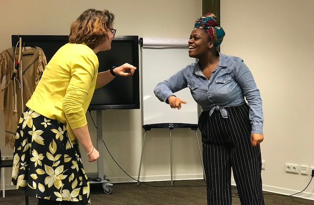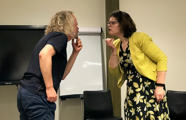 “Weet je wat jij bent? Een deurklink!” De opdracht die docent Susan Remers van theaterschool Hakoena aan haar spelers geeft leidt tot hilariteit: scheld elkaar eens flink uit met de namen van voorwerpen. “Ik wil niet veel zeggen, maar jij bent zo’n ontzettende badslipper”. Susan lacht: “Dat heeft nog nooit iemand tegen me gezegd.” Het spel krijgt een andere draai als de spelers de scheldwoorden moeten opvatten als compliment. “Kijk wat dat met de scène doet”.
