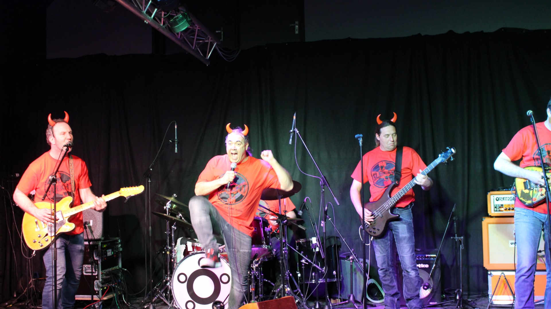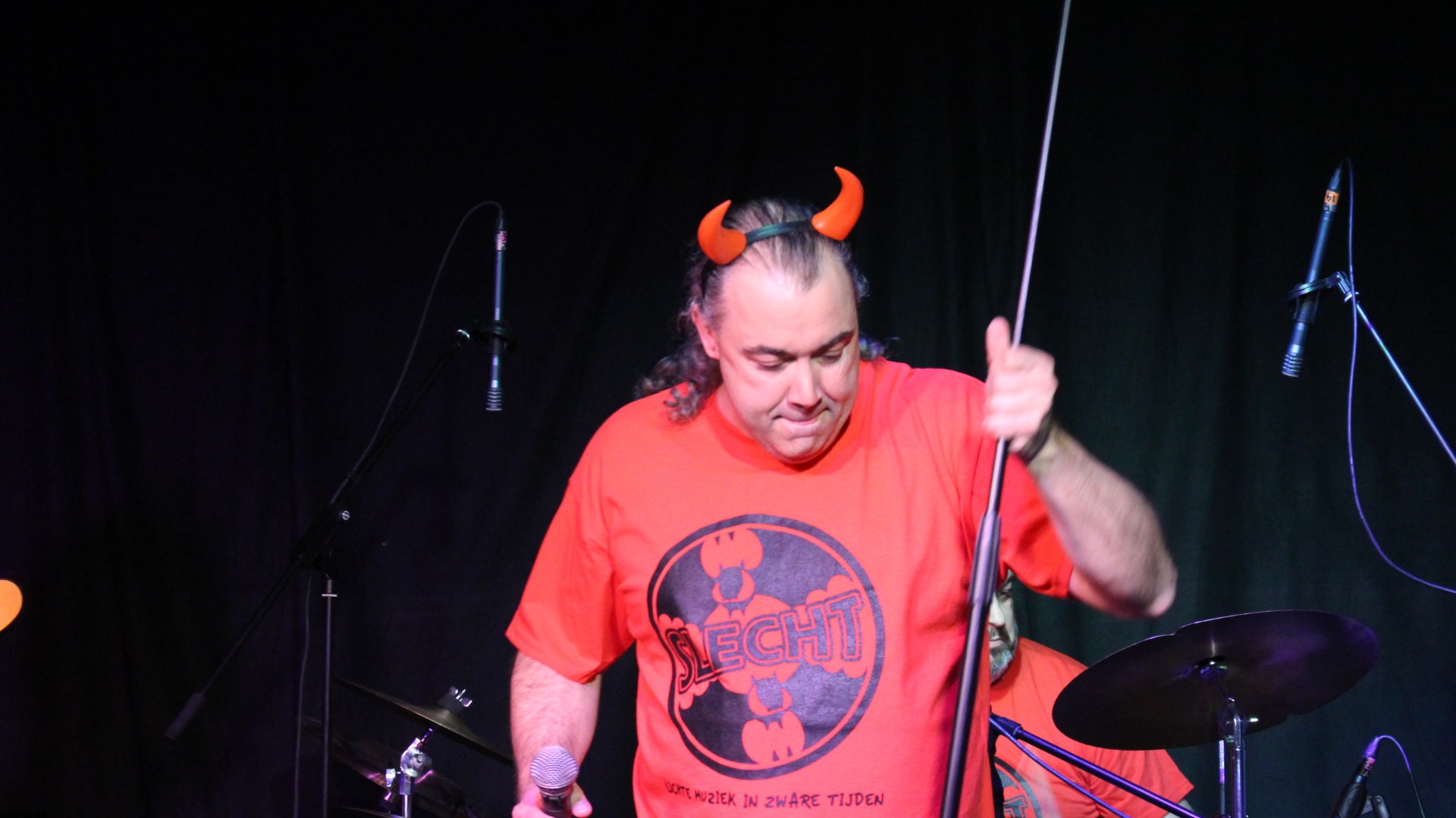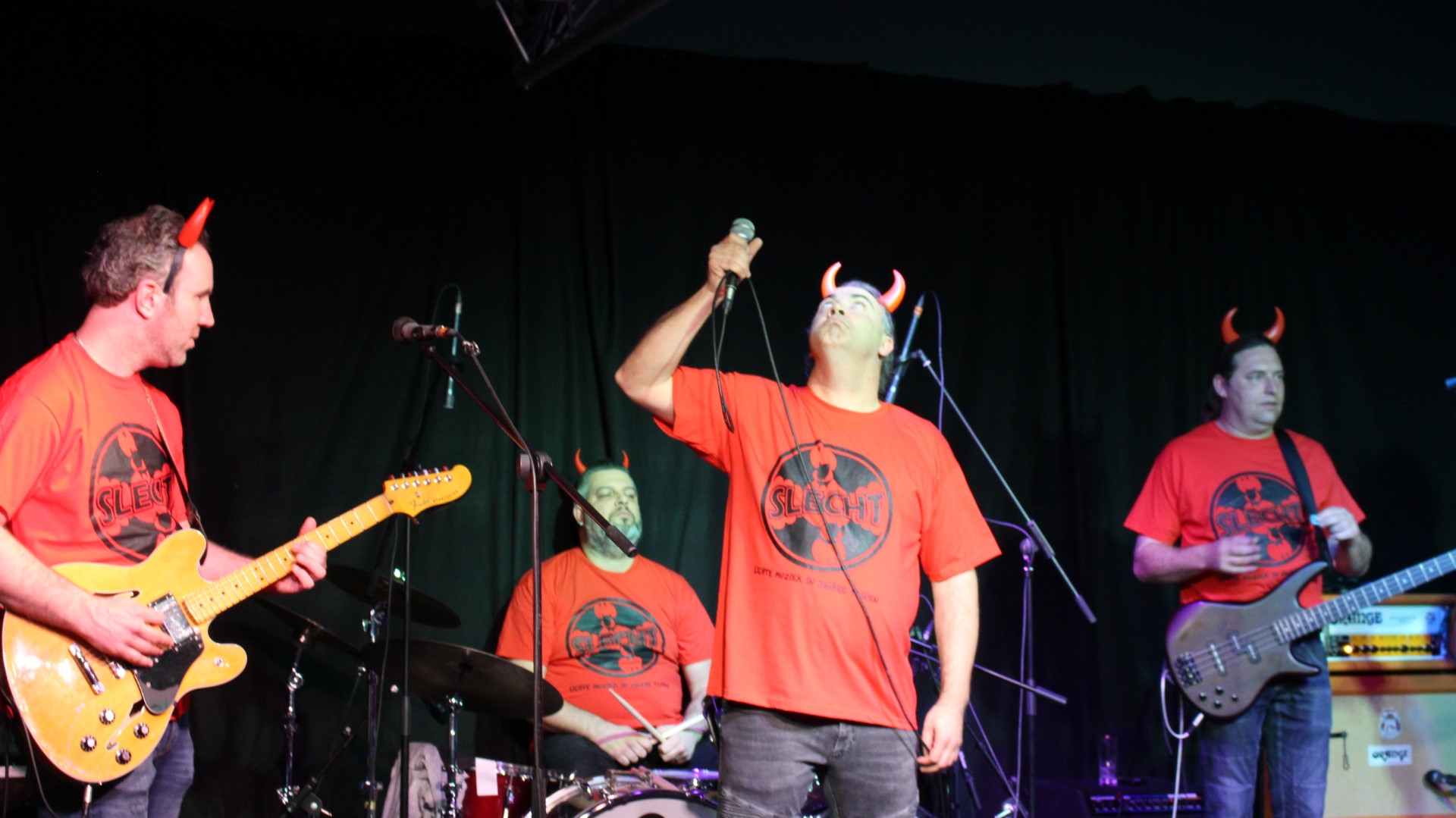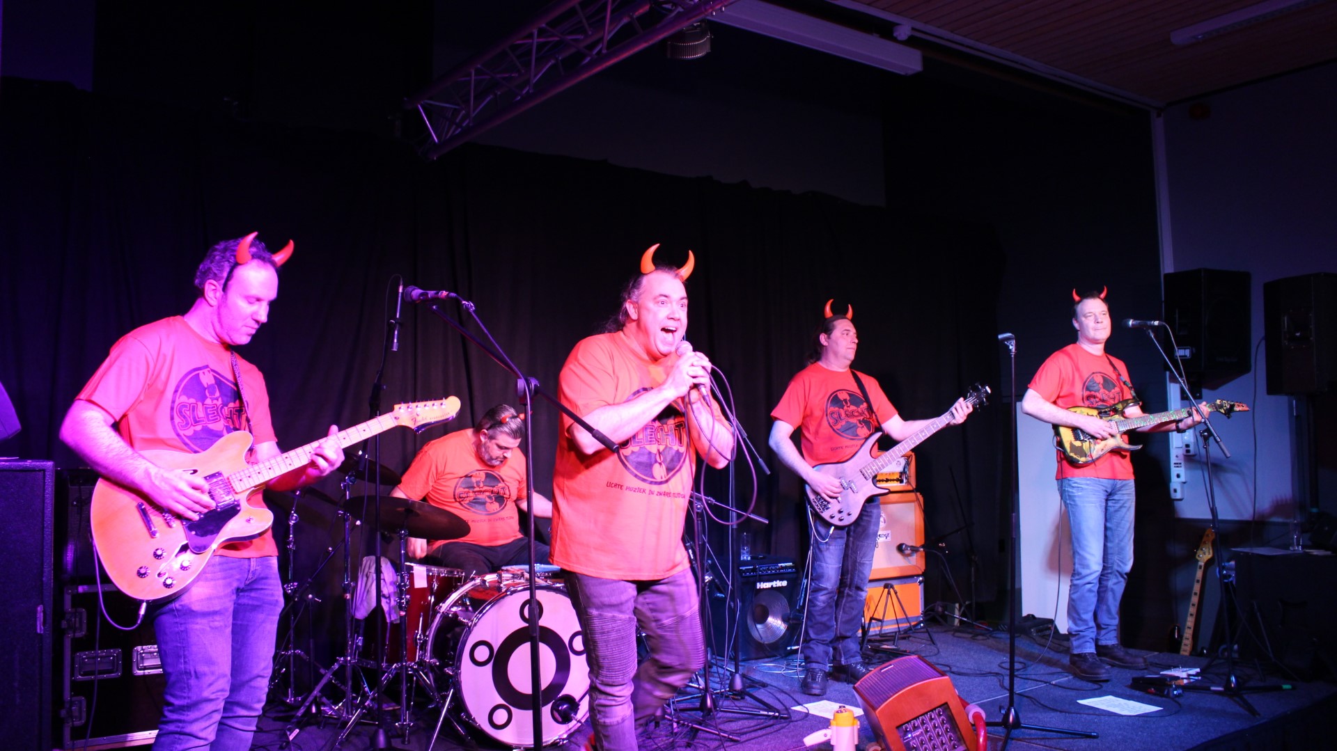 Rond 22:00 uur brak de hel los en bracht SLECHT nummers als “Hanekam” en “Flink van Bill” vol passie! Gradje Peters, Martijn Verharen, Jeroen van Halst, Paul en Sander van den Boogaard speelden fantastisch! Natuurlijk ontbraken ook de hoorntjes niet!