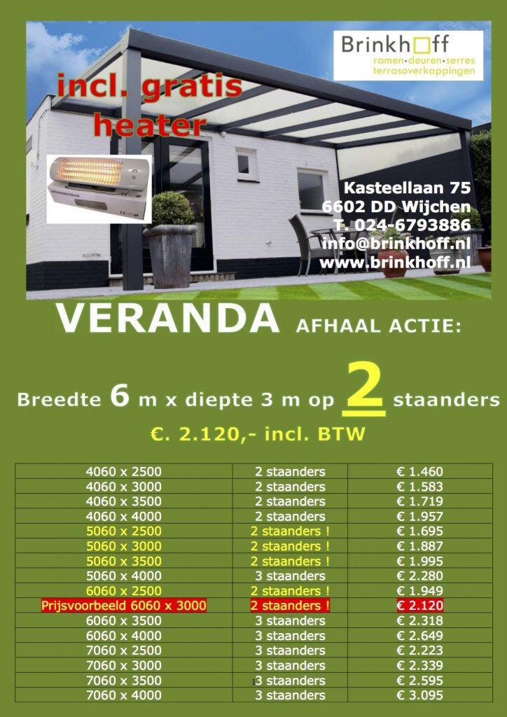 Het Wijchense bedrijf dat gespecialiseerd is in prachtige terrasoverkappingen, serres en kozijnen en een begrip in de regio is, heeft een speciale actie voor u! Eigenaar Robin Brinkhoff vertelt: “De markt van overkappingen wordt overspoeld. Met de verkoop van deze Giallo overkappingen willen we laten zien dat we op elk niveau onze producten kunnen leveren. Met andere woorden: voor een klein budget een hoogwaardige overkapping, want vanaf €1460,- incl. vind je deze overkappingen nergens. En je krijgt er ook nog een gratis terrasheater bij!” www.brinkhoff.nl.
