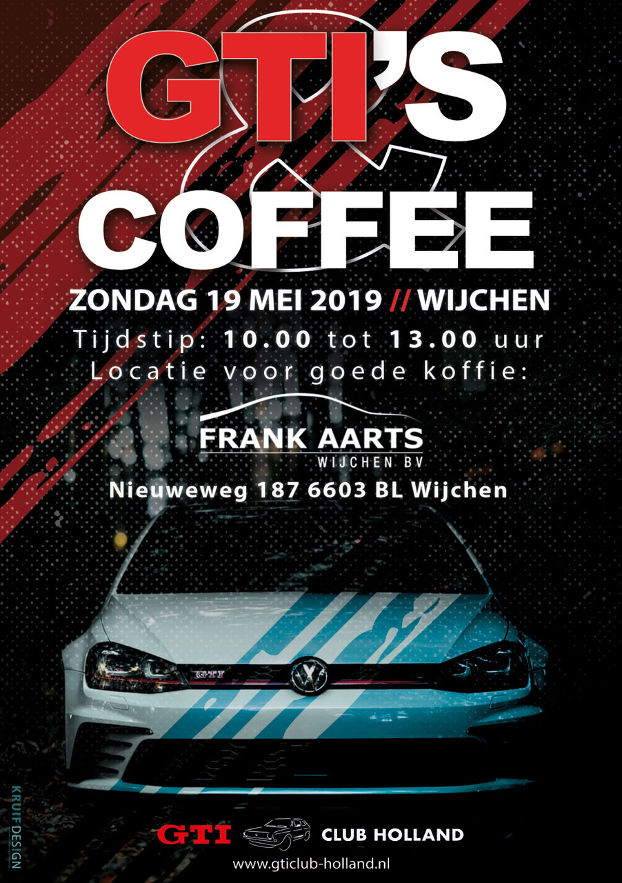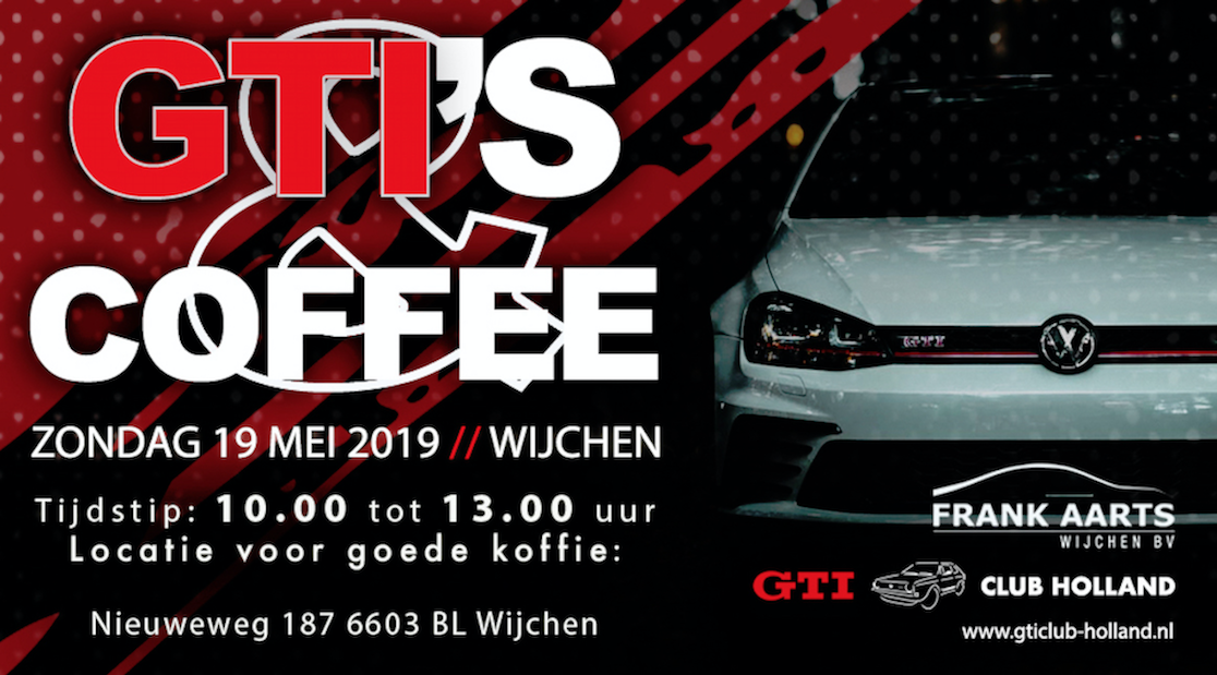 Rij jij een VW Golf GTI, RallyeGolf, Golf III VR6, Golf IV V6 4Motion, Golf R(32) of een andere 'dikke' Golf zoals bijvoorbeeld de GTI Clubsport (S) of een Golf GTI TCR? Kom dan zondag 19 mei a.s. naar Wijchen voor de 3e editie van 'GTI's & Coffee'!