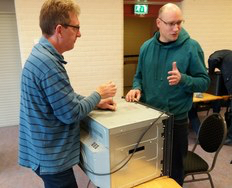 Zijn moeite om het apparaat uit zijn keuken te halen, in z’n auto te zetten en bij het RepairCaféWijchen naar binnen te sjouwen, werd beloond, want het defect is opgespoord én hersteld. Al dat zware werk was dus niet voor niets geweest!