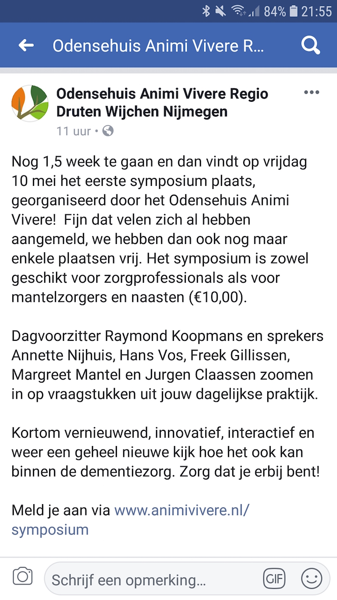 Kortom vernieuwend, innovatief, interactief en weer een geheel nieuwe kijk hoe het ook kan binnen de dementiezorg. Zorg dat je erbij bent!