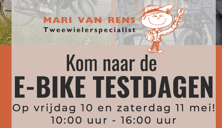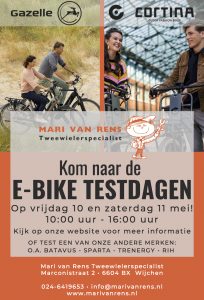 Op vrijdag 10 en zaterdag 11 mei houdt Tweewielerspecialist Mari van Rens van 10.00 tot 16.00 uur testdagen om een e-bike uit te proberen.