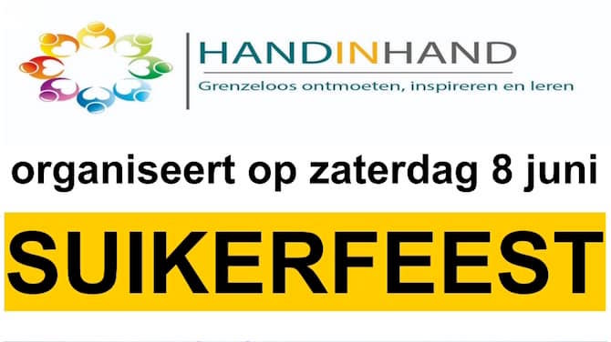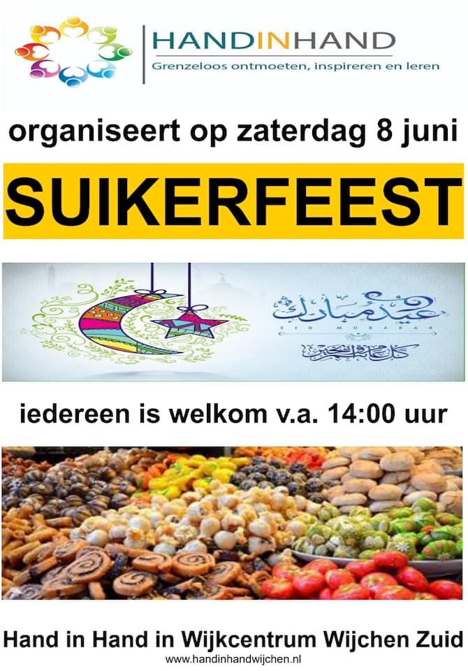 Op zaterdag 8 juni 2019 viert Social Club Hand in Hand in wijkcentrum Wijchen-Zuid het einde van de Ramadan met het Suikerfeest. Vanaf 14:00 uur is iedereen welkom voor een hapje en een drankje. Er is een springkasteel voor de kinderen en een presentje voor iedereen.