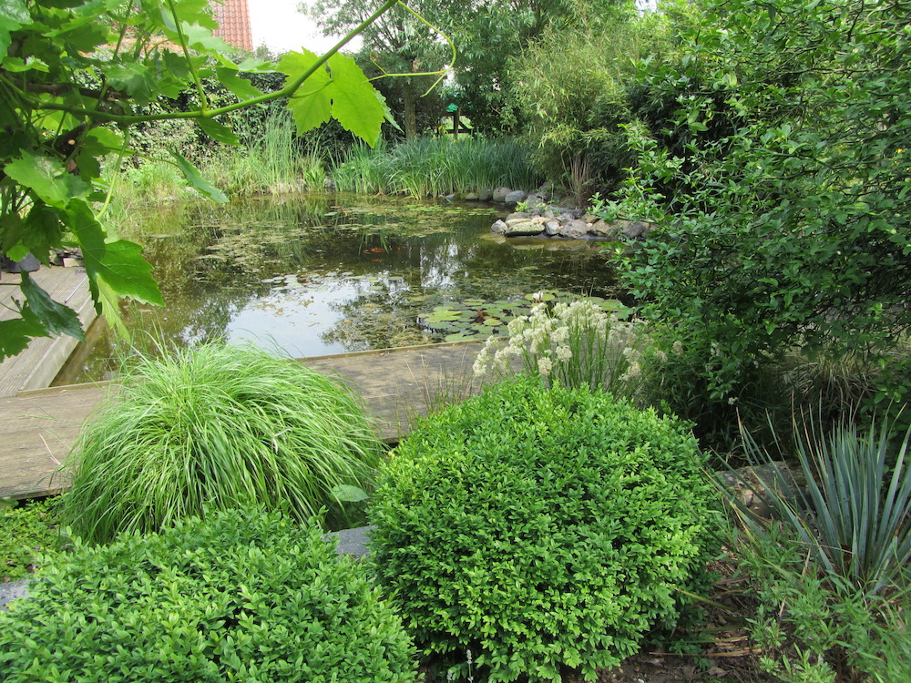 Weelderige tuin van 2000 m² met borders op kleur, vijver, moes- en fruittuin.