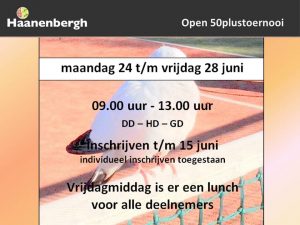 Van maandag 24 tot en met vrijdag 28 juni wordt het Haanenbergh Open 50plus toernooi gehouden op het tennispark van Haanenbergh - sportpark Noord in Wijchen.