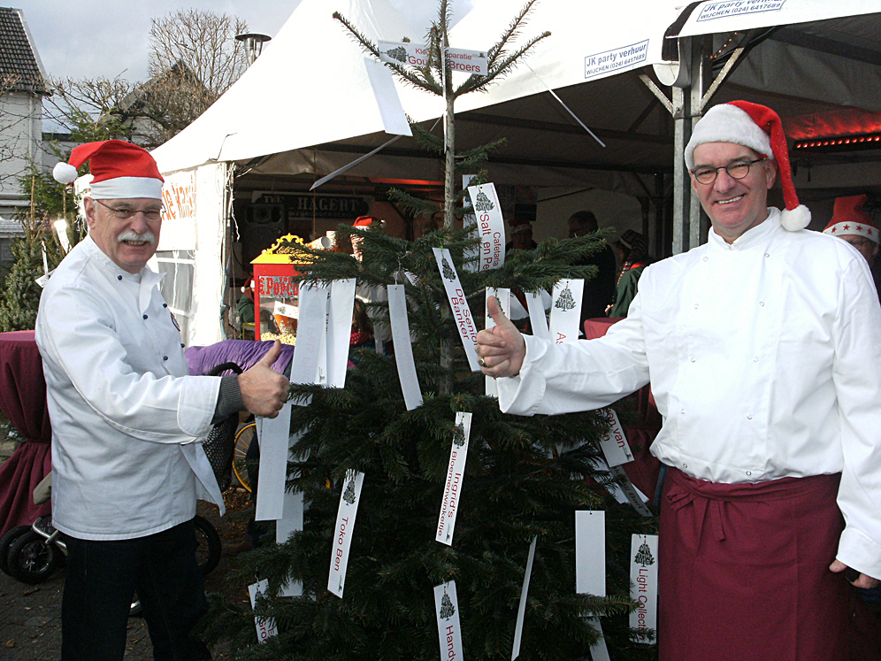 Voor elk ingeleverd kerstpakket of een gelijkwaardig geldbedrag krijgt de gever een lot en dingt mee naar een meubelcheque van € 500,-. Deze cheque wordt beschikbaar gesteld door Oosterbaan Living, Graafseweg 777, Wijchen. De trekking zal plaatsvinden onder toeziend oog van notaris Van Beek, zondag 21 december 2014 om ca. 16.30 uur in onze tent op de markt.