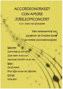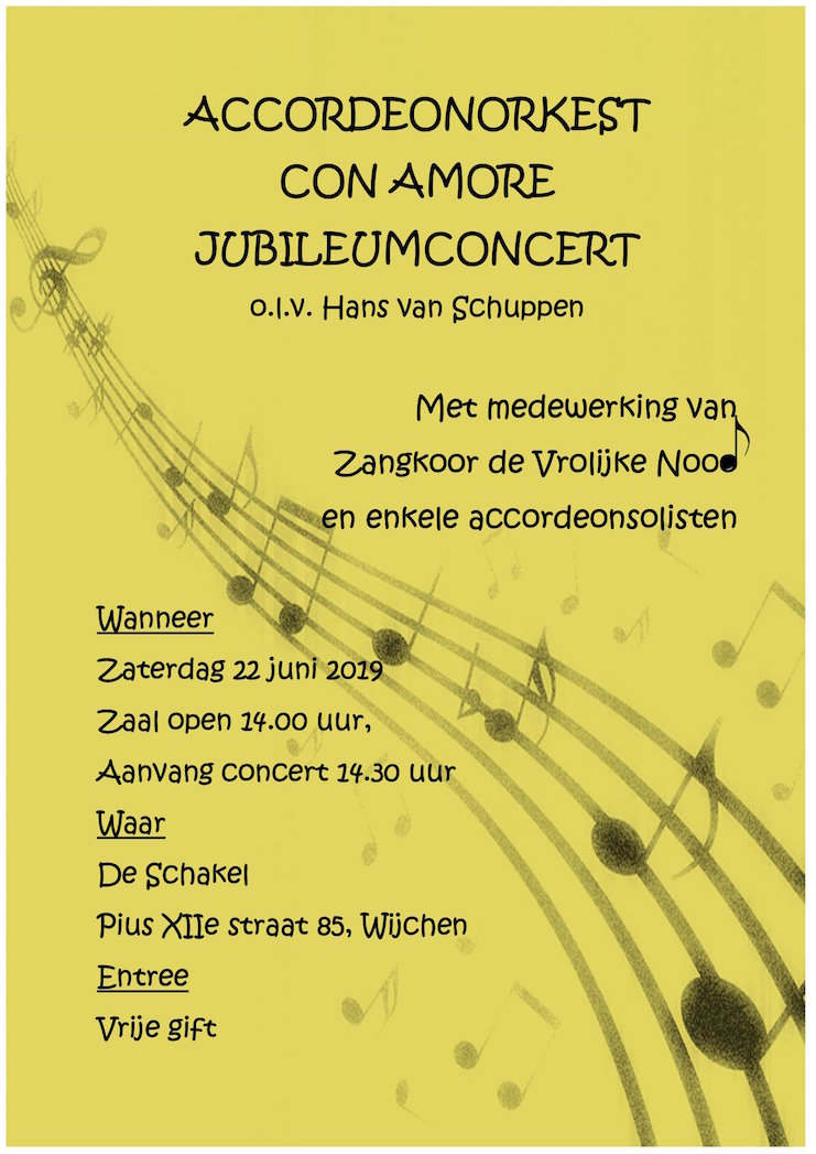 Op zaterdag 22 juni 2019 geeft Con Amore vanwege haar 40-jarig jubileum een concert in de Schakel in Wijchen, van 14.00 tot 16.00 uur, Pius XIIe straat 85. De entree is gratis, een gift wordt op prijs gesteld.