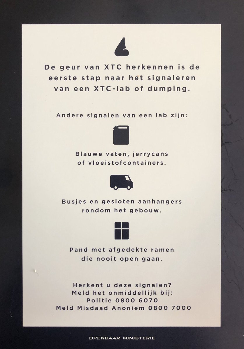 Burgemeester Hans Verheijen roept op via twitter: "Het aantal drugsdumpingen Veilgheidsregio Gelderland-Zuid is inmiddels goed voor 25% in héél Oost-Nederland. In de directe omgeving daarvan vindt productie plaats. Ook in Wijchen. Help ons deze te vinden (voor tips zie foto’s)! Geur: anijs, ouzo-achtig. 0900-8844 of via de wijkagent of anoniem via 0800-7000."