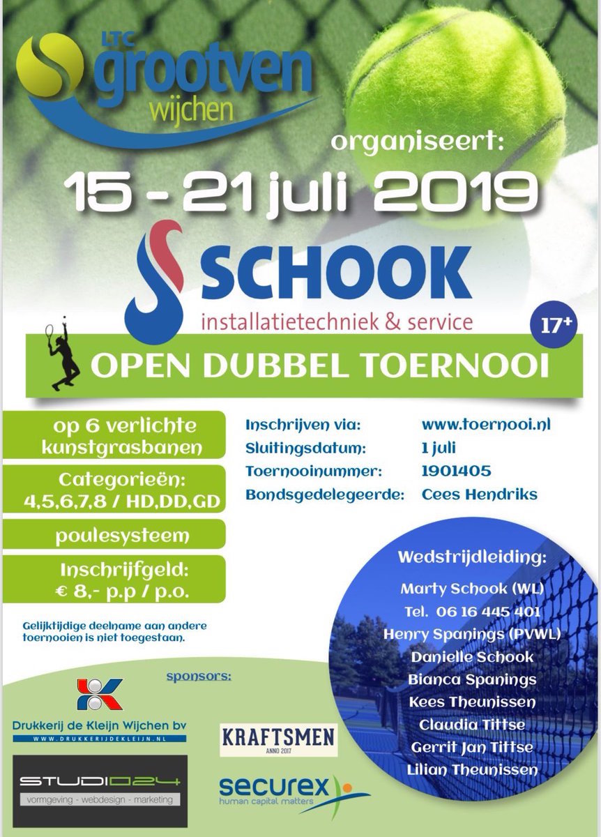 LTC Grootven houdt haar Open Dubbel Tennistoernooi van 15 t/m 21 juli. De uiterste inschrijfdatum is verplaatst naar woensdag 3 juli! Dus schrijf je gezellig nog even in voor dit zomers toernooi via