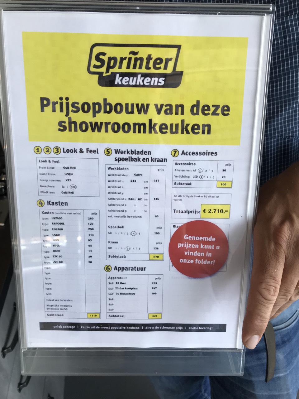 Hier een topkwaliteit keuken voor een topprijs van €2710!! En dit is inclusief apparatuur zoals oven, gaskookplaat en afzuigkap! (Zie afbeelding) Meer info: Sprinter Keukens, tel 024-3020000.