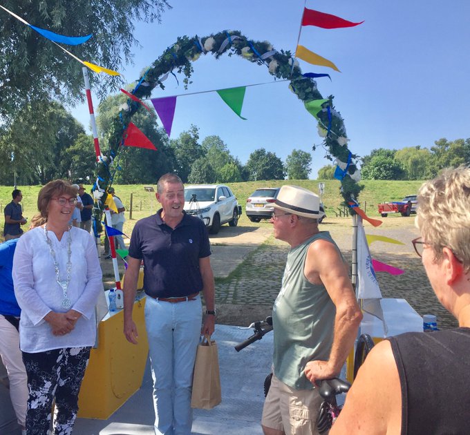 Wethouder Nick Derks laat via Twitter weten: "Vandaag hebben burgemeester Buijs van de gemeente Oss, directeur Alex Kwakernaak van Uiterwaarde en ik de 100.000ste passagier van de voetpont tussen Ravenstein en Niftrik feestelijk onthaald. Het is zowaar een bekende uit Niftrik!