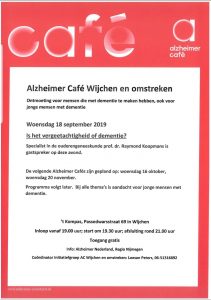 woensdag 18 september 2019. Het thema van deze avond is: Is het vergeetachtigheid of dementie? Specialist in de ouderengeneeskunde prof. dr. Raymond Koopmans is gastspreker op deze avond. Volgende avonden op 16 oktober en 20 november.