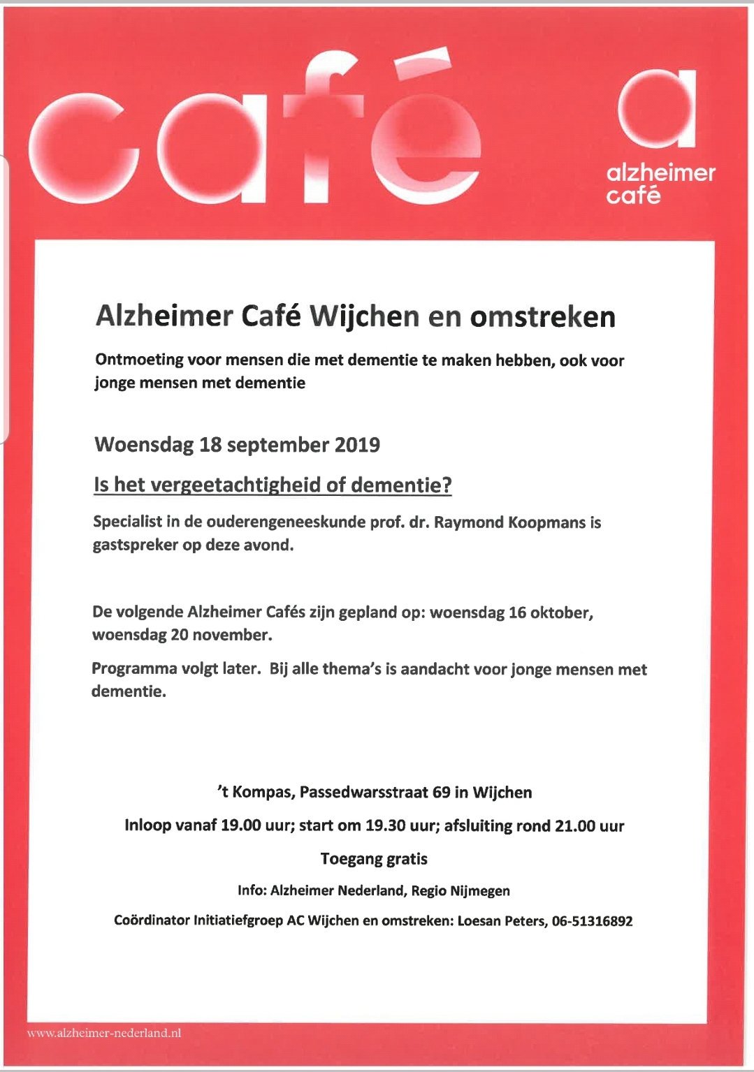 De uitdrukking “Alzheimer Café” kent iedereen wel. In Nederland worden al op ruim 250 plekken Alzheimer Cafés georganiseerd en de laatste jaren neemt met de stijging van het aantal mensen met dementie ook de betekenis van het Alzheimer Café snel toe. Ook in onze gemeente is die behoefte gegroeid, onder mensen met dementie en vooral ook hun mantelzorgers. Een lokale initiatiefgroep met uiteenlopende sociale, medische, bestuurlijke en (mantel)zorgende achtergronden heeft gedurende 2019 met hulp van Alzheimer Nederland Regio Nijmegen de voorbereidingen getroffen voor een Alzheimer Café in de gemeente Wijchen.