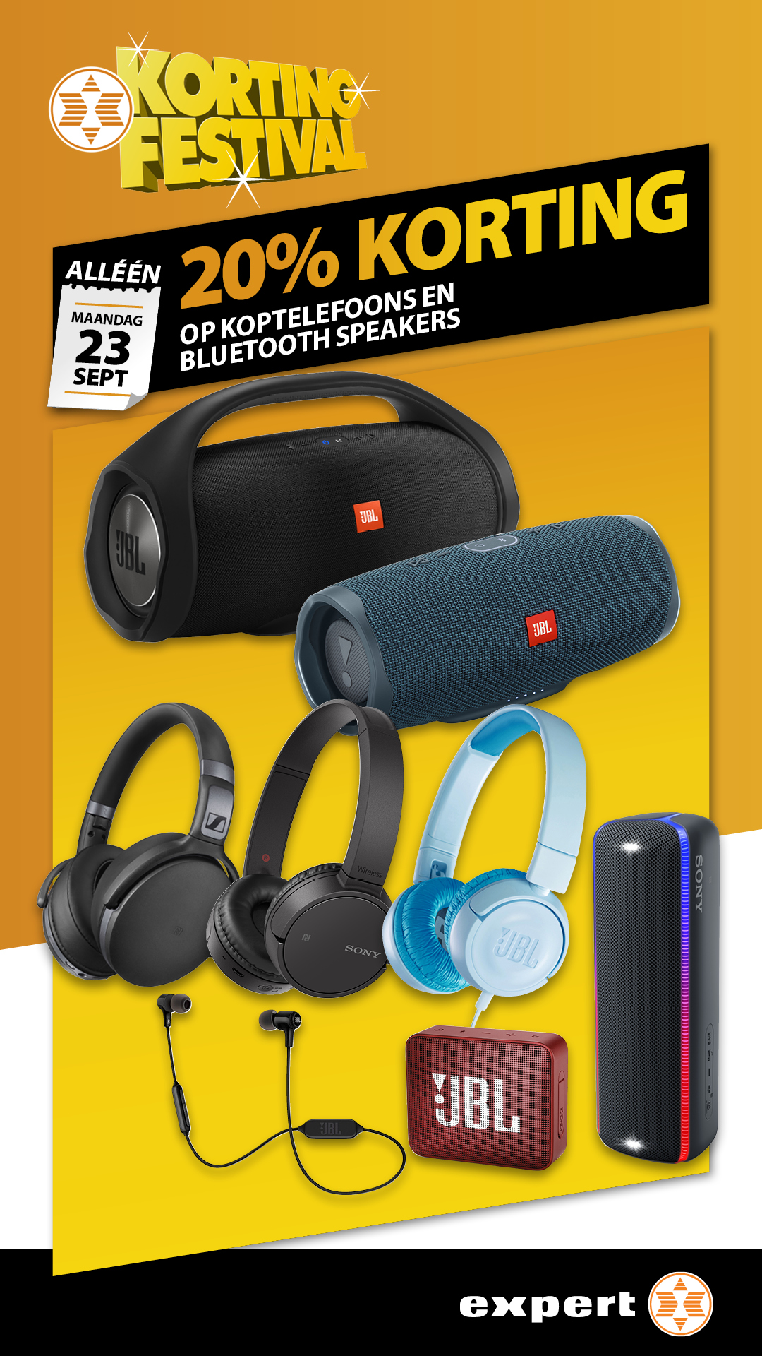 Ook maandag 23 september is het feest bij Expert in de Touwslagersbaan: 20% korting op koptelefoons en bluetooth speakers! Daarvan wilt u toch zeker ook profiteren?! En bekijk ook alvast de kortingen van de komende week hieronder! Volg Expert Wijchen ook op Facebook. Touwslagersbaan 32, Wijchen, 024-645 3080.