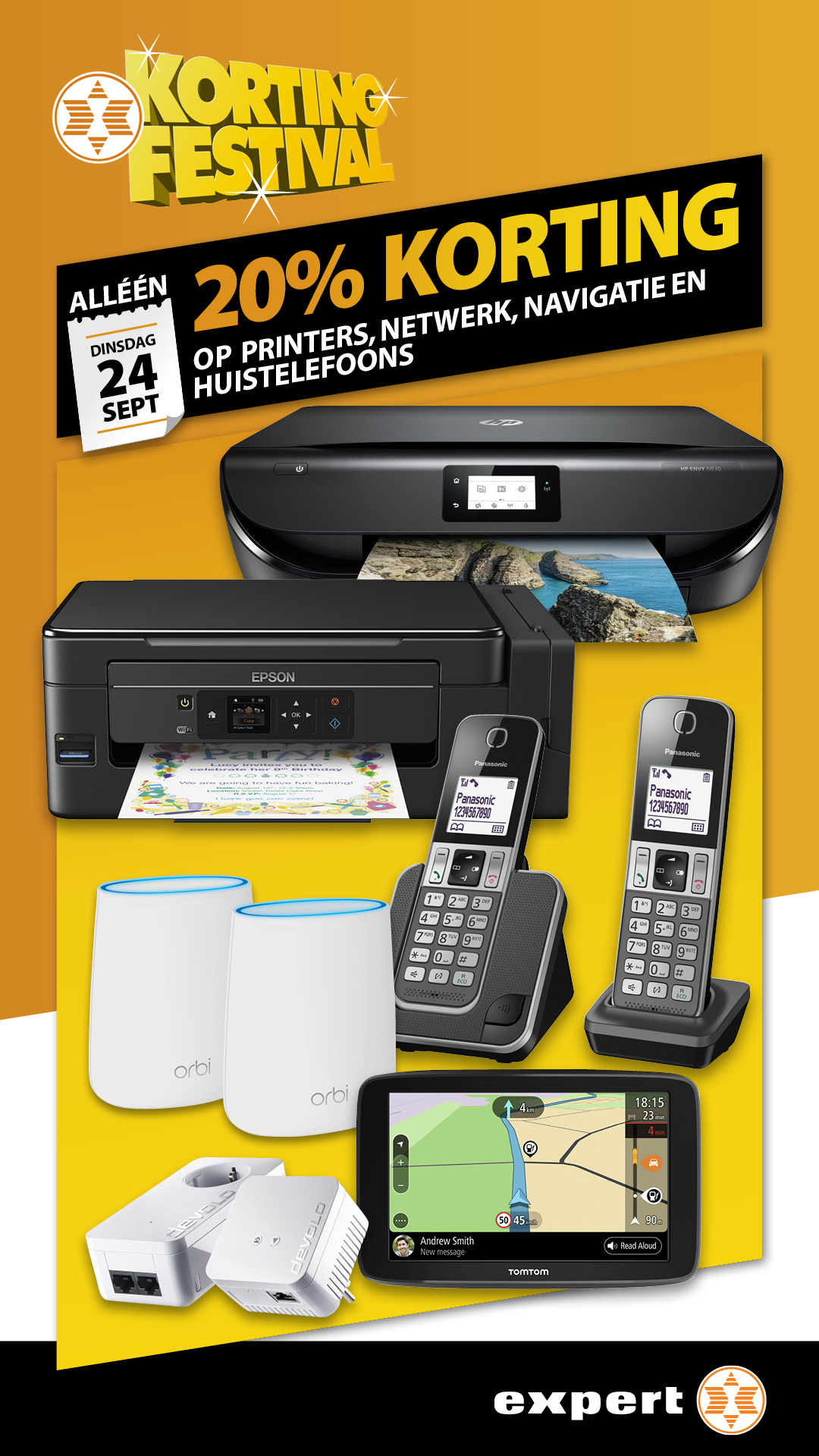 Ook dinsdag 24 september is het feest bij Expert in de Touwslagersbaan: 20% korting op printers, netwerk, navigatie en huistelefoons! Daarvan wilt u toch zeker ook profiteren?! En bekijk ook alvast de kortingen van de komende dagen hieronder! Volg Expert Wijchen ook op Facebook. Touwslagersbaan 32, Wijchen, 024-645 3080.