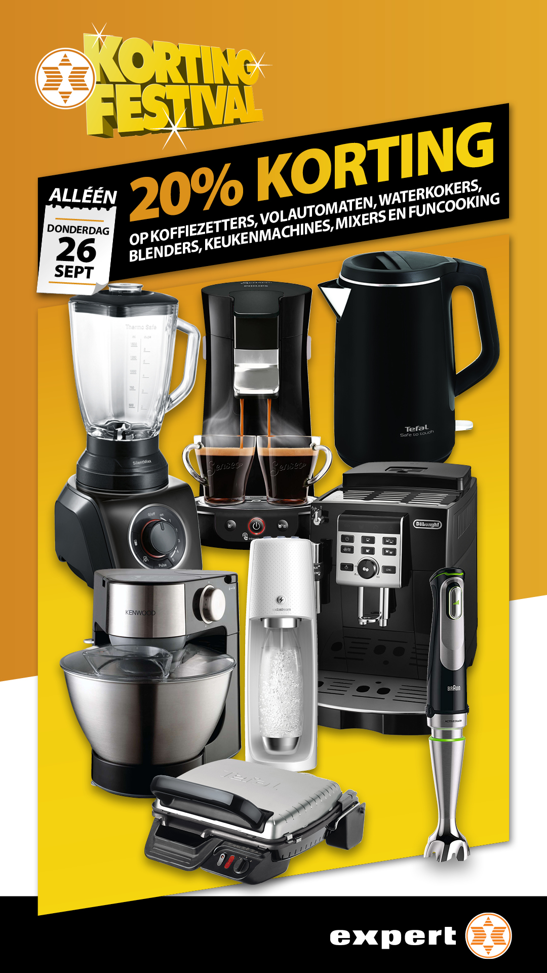 Ook donderdag 26 september is het feest bij Expert in de Touwslagersbaan: 20% korting op koffiezetters, volautomaten, waterkokers, blenders, keukenmachines, mixers en funcooking! Daarvan wilt u toch zeker ook profiteren?! En bekijk ook alvast de kortingen van de komende dagen hieronder! Volg Expert Wijchen ook op Facebook. Touwslagersbaan 32, Wijchen, 024-645 3080.