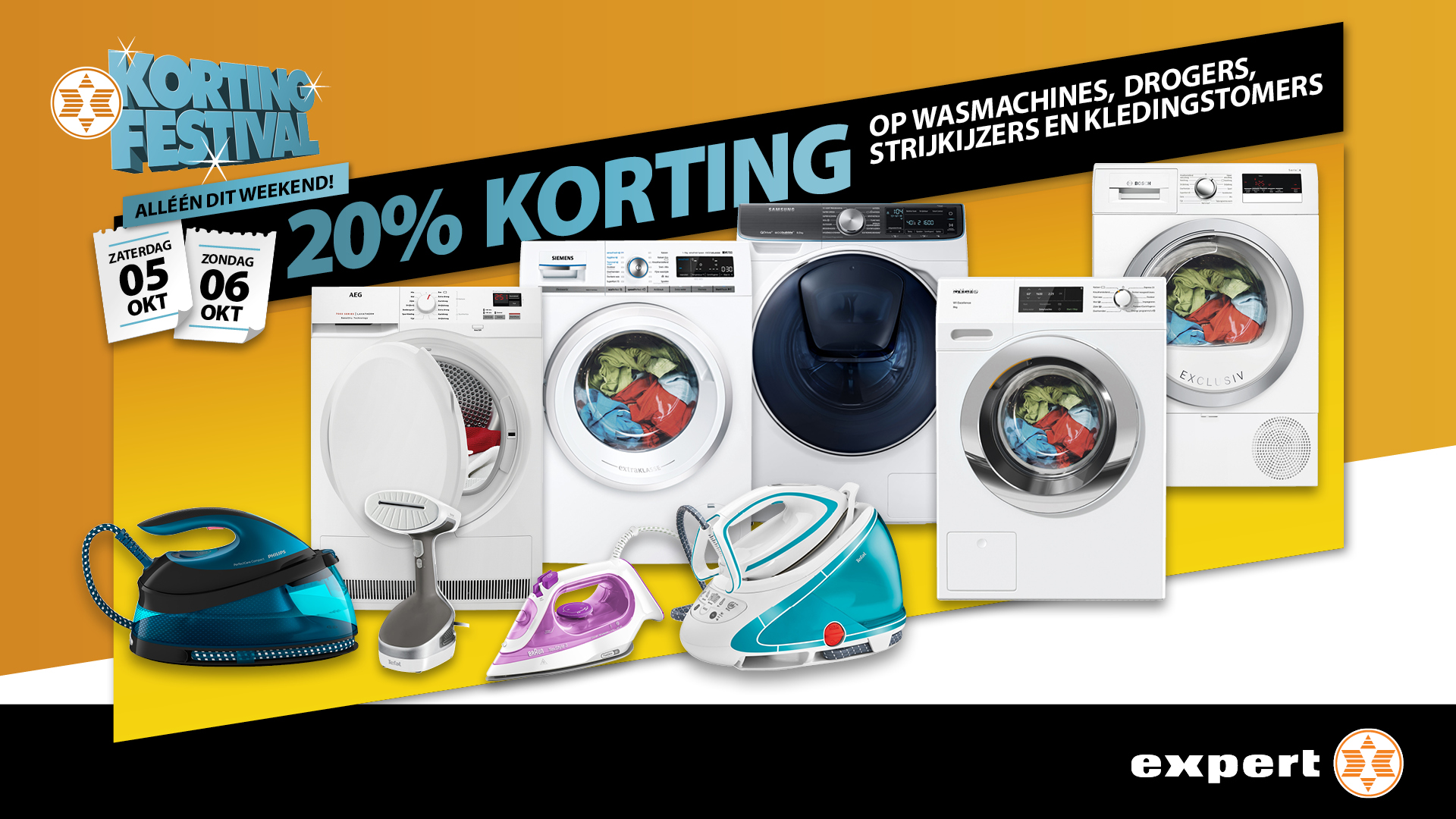 Ook zaterdag 5 en zondag 6 oktober is het feest bij Expert in de Touwslagersbaan in Wijchen: 20% korting op wasmachines, drogers, strijkijzers en kledingstomers! Daarvan wilt u toch zeker ook profiteren?! Volg Expert Wijchen ook op Facebook. Touwslagersbaan 32, Wijchen, 024-645 3080.
