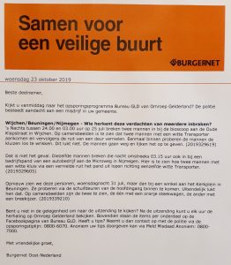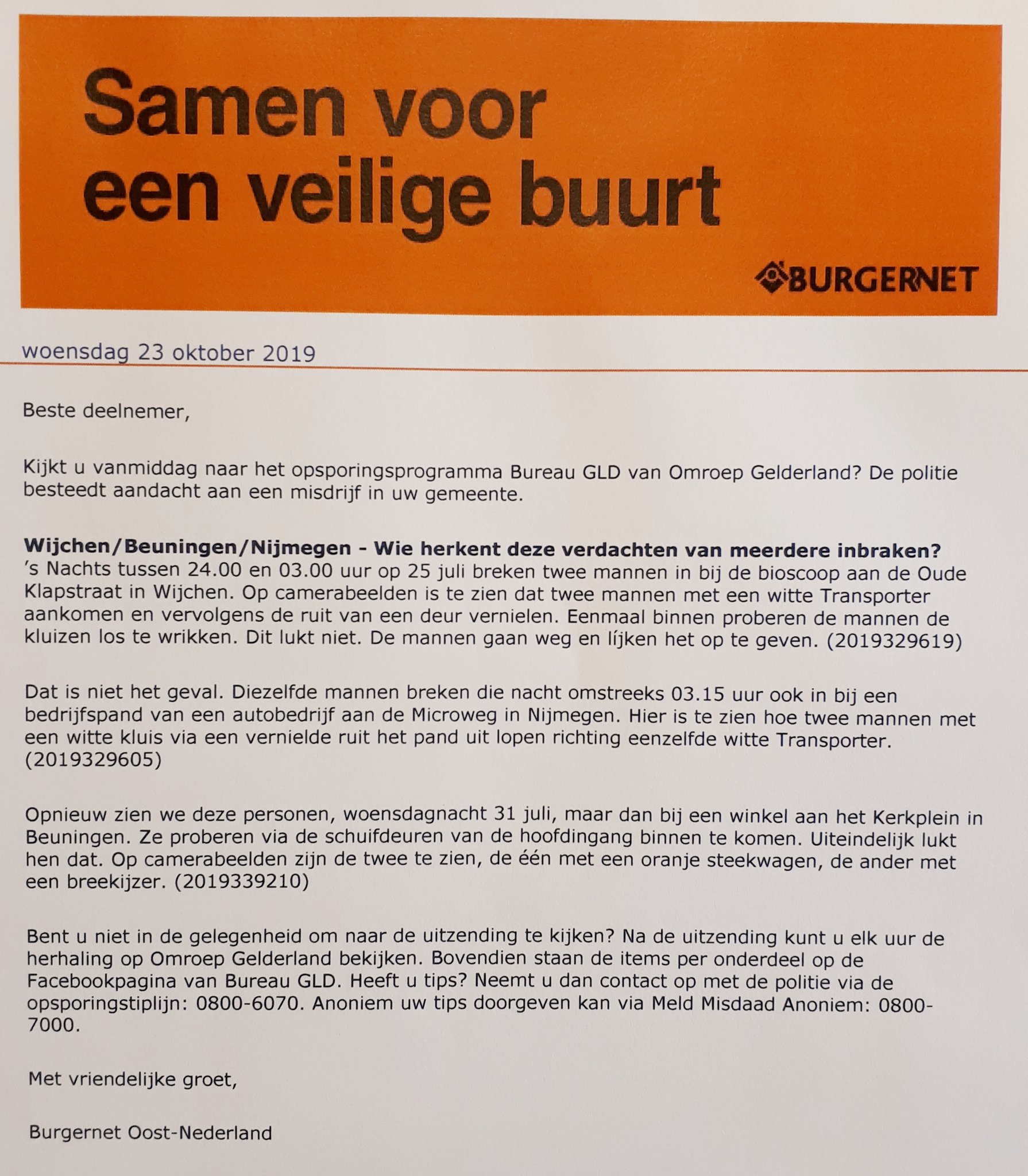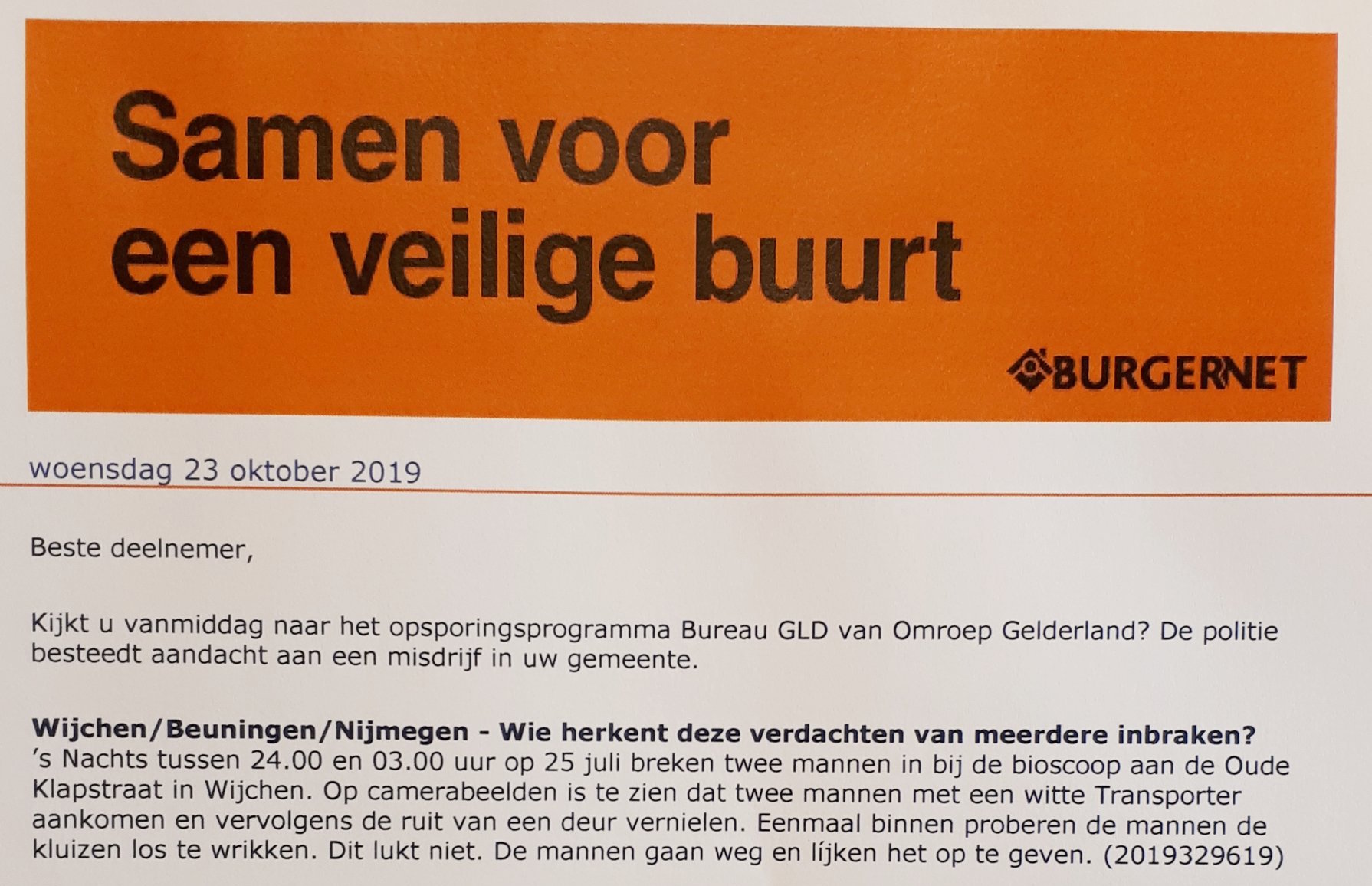 Wijkagent Henry van Galen maakte ons hierop opmerkzaam via Twitter: "Kijkt u vandaag ook naar het opsporingsprogramma BureauGLD van Omroep Gelderland? Daarin o.a. aandacht voor de op 25 juli gepleegde inbraak bij de bioscoop aan de Oude Klapstraat in Wijchen."