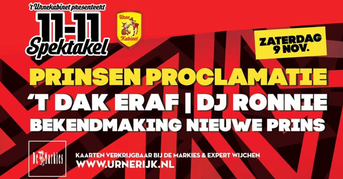 Zaterdag 9 november 11/11 Spektakel: ‘Wie wordt de nieuwe prins en jeugdprins(es) van het Urnerijk?’