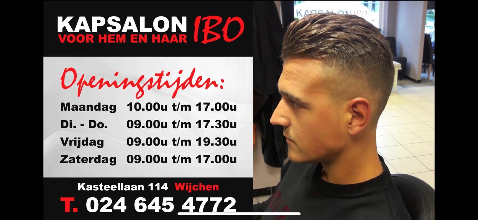 Groot voordeel bij Kapsalon IBO is het feit dat u met of zonder afspraak terecht kunt aan de Kasteellaan 114. Het kappersbedrijf is geopend maandag 10.00u-17.00u, dinsdag t/m donderdag 9.00u-17.30u, vrijdag 9.00u-19.30u en zaterdag 9.00u-17.00u. Voor meer info bel 024-6454772 of 0614565910.