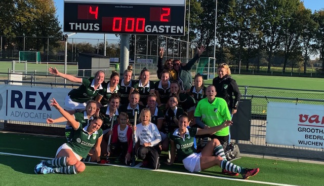 De Apeldoornse ploeg kwam naar Wijchen en ze hadden tot nu toe slechts één wedstrijd verloren, één gewonnen en de rest allemaal gelijk gespeeld. Met dit in het achterhoofd kon je verwachten dat het een lastige middag zou worden. De Wijchense ploeg begon overtuigend aan de wedstrijd en liet dit in het eerste kwart ook duidelijk merken. In de 7e minuut was het Elle de Korte die scherp was en de rebound na een strafcorner goed benutte. Tijdens de korte pauze wist de coach van Apeldoorn zijn ploeg wat beter te positioneren, wat resulteerde in een gelijkwaardige wedstrijd voor de rest van de eerste helft. Apeldoorn kreeg een 5-tal strafcorners, maar werd hier niet gevaarlijk mee. 1-0 was de ruststand.