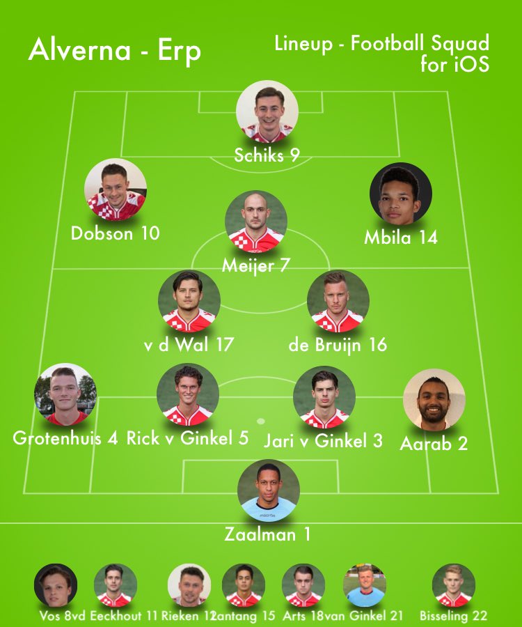 Gemakkelijk ging het deze middag niet op het ‘Bospad’, deels door dat er niet het niveau gehaald werd van vorige week, en voor een groot deel dat tegenstander Erp zeker geen slechte ploeg is. De eerste speldenprikjes waren van Alverna, maar de eerste echte kans was voor Erp, Emiel vd Sanden kopte een vrije trap op de lat, en ook de terugspringende bal kon niet worden binnengewerkt. In het vervolg van de eerste helft is Alverna de iets beter voetballende ploeg, Bart Schiks dwingt met een schot doelman Dennis van Ballegooy tot een redding, op een kopbal van Bart is de doelman kansloos, maar de paal brengt redding. Een schot van Danny Meijer beland via een verdediger net naast, en een lange pass van uitblinker Jari van Ginkel word door Cas van der Wal niet op waarde geschat. Ook Erp blijf loeren op kansen, en krijgt die ook. De beste krijgen ze door fouten van Alverna, in de 18e minuut verslikt Robert Zaalman zich in de zestien bij het uitspelen van een tegenstander, maar het loopt goed af. Toch komt Alverna op voorsprong, na 39 minuten bedient Cas van der Wal op rechts Johnny Dobson, en die verrast de doelman in de korte hoek (1-0). De laatste wapenfeiten voor rust zijn weer voor Erp, eenmaal loopt het goed af na slecht uitverdedigen, en bij een volgende uitval van Erp moet Robert Zaalman redding brengen.