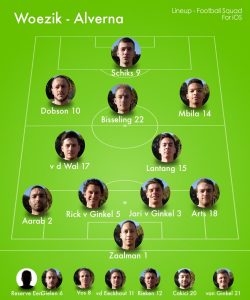Opstelling Alverna: Robert Zaalman; Dennis Arts, Jari v Ginkel ©, Rick v Ginkel, Yassine Aarab; Mels Lantang, Cas van der Wal (’78 rood); Owen Mbila (’65 Lorenzo Rieken), Sander Bisseling (’78 Danny Vos), Johnny Dobson(’89 Andac Cakici); Bart Schiks