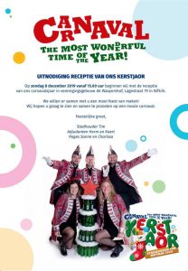 Op zondag 8 december organiseert carnavalsvereniging de Maospruvers in de Waayershof aan de Lagestraat 19 in Niftrik een receptie voor Stadhouder Tim en zijn gevolg, adjudanten Harm en Koert en pages Sanne en Charissa. Vanaf 15:00 uur beginnen ze met de receptie van het Kerstjaor, 'the most wonderful time of the year': "Wij hopen dat jullie alle aanwezig zullen zijn om samen te proosten op een mooie carnaval!"