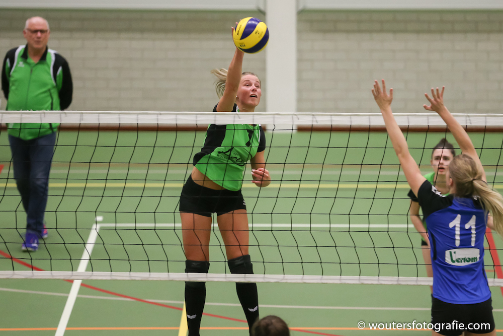e timeout aan. Dit hielp even doordat Anne Veenstra haar service nipt uit het veld sloeg. Michelle Koolen sloeg een harde bal binnen en de volgende Spivoaanval raakte de antenne 23-20. Esmee Driessen sloeg haar service uit het veld. Stefanie Beekers vond het welletjes en met een mooie aanval en een killblok bezorgde zij haar team de overwinning van de 1e set.