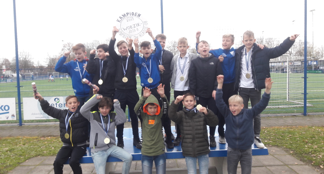 Woezik JO13-3 is ongeslagen kampioen geworden in de 2e klasse. De jongens van coach Roy Peters hadden uiteindelijk genoeg aan een gelijk spel thuis tegen Brakkestein JO13-1. De tallentvolle ploeg was een jaar eerder doorgeschoven naar het grote veld en zal na de winterstop uitkomen in de 1e klasse KNVB.