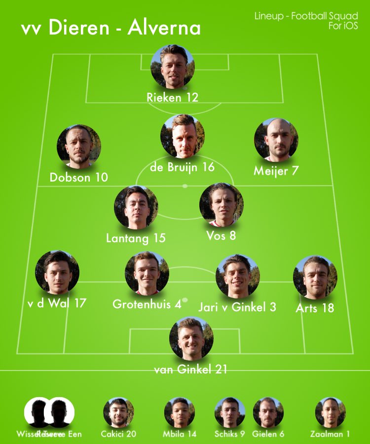 Na rust ebde de concentratie bij Alverna langzaam weg, Alverna hoefde niet meer, vv Dieren kon niet meer. Zodat er een weinig enerverende tweede helft op de mat werd gelegd, en de weinige toeschouwers die Ajax lieten voor wat het was, niet verwend werden. Tien minuten na rust was er nog een uitval van vv Dieren waarbij Niek van Ginkel zich nog moest strekken om er een hoekschop van te maken. Die hoekschop leverde ook nog een kans op voor de thuisploeg. In de slotfase had Alverna de stand nog iets uit kunnen bouwen, maar de ingevallen Bart Schiks en Owen Mbila lieten beiden een grote kans liggen. Conclusie: Alverna deed wat het moest doen (winnen), overwintert in de beker, spelers met minder minuten in de benen hogen dat op, voor de vijfde keer op rij ‘nul’ gehouden, kortom. Een nuttige avond!!