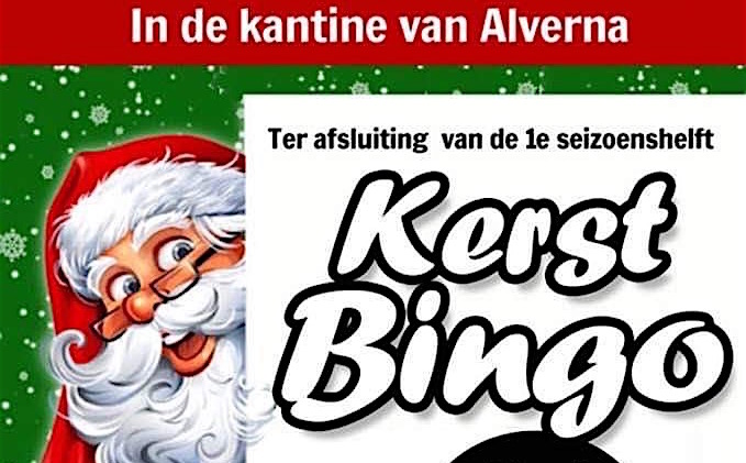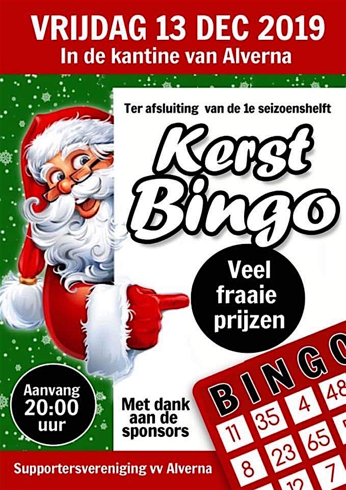 Op vrijdagavond 13 december organiseert VV Alverna de traditionele Kerstbingo, ter afsluiting van de 1e seizoenshelft in het clubhuis van Sportpark 'Het Bospad' aan het Bospad 5 te Alverna. Vanaf 20:00 uur gaan de bingoballen rollen en er zijn weer fraaie prijzen te winnen.