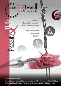 Alweer staat een avontuurlijk programma op stapel, met veel onbekend werk. Dit concert zingt Gemengd Vocaal Een voor Twaalf onder leiding van gastdirigent Michel de Kort. In ‘Passie & Tijd’ klinken juweeltjes van muziek, over de engelen van Buchenberg en over de naderende passietijd. Het lijden van Jezus wordt vertolkt door Lotti, Graun en Kuhnau - componisten van eeuwen terug - en de hedendaagse Tučapský. Of het verlangen naar eindeloze tijd gelukkig maakt? Je vraagt het je af als je in de eindeloze lijnen van Miškinis de dissonanten hoort. Een van de boodschappen van Chatman over tijd is: geniet van het leven en de liefde. U bent van harte welkom.