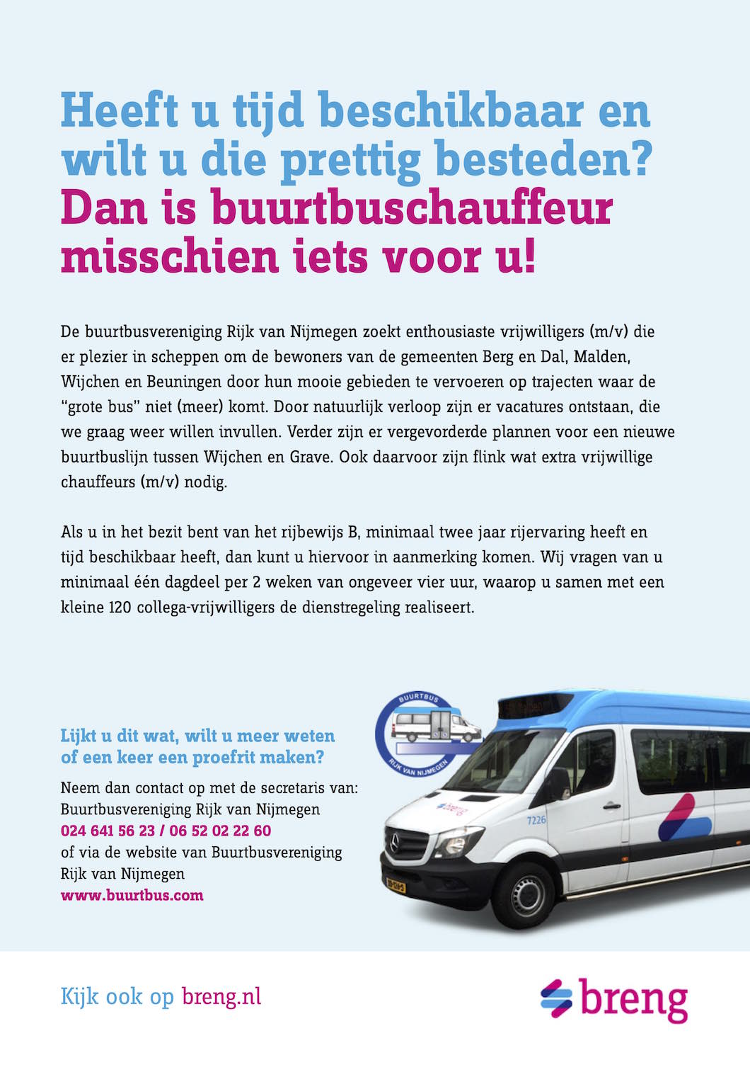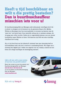 De buurtbusvereniging Rijk van Nijmegen zoekt enthousiaste vrijwilligers (m/v) die er plezier in scheppen om de bewoners van de gemeenten Wijchen, Berg en Dal, Malden en Beuningen door hun mooie gebieden te vervoeren op trajecten waar de 'grote bus' niet (meer) komt: "Door natuurlijk verloop zijn er vacatures ontstaan, die we graag weer willen invullen. Verder zijn er vergevorderde plannen voor een nieuwe buurtbuslijn tussen Wijchen en Grave. Ook daarvoor zijn flink wat extra vrijwillige chauffeurs (m/v) nodig.