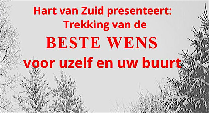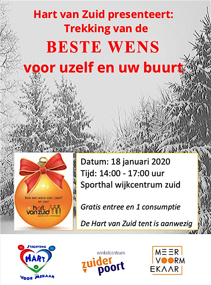 Op zaterdag 18 januari presenteert 'Hart van Zuid' in de sporthal in van Wijkcentrum Zuid van 14.00-17.00 uur de trekking van 'De beste wens' voor uzelf en uw buurt. Het wordt een middag vol info en plezier.