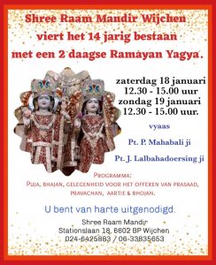 U bent van harte uitgenodigd voor een 2-daagse Ramayan Yagya op 18 en 19 januari 2020 in de Hindoestaanse tempel Shree Raam Mandir Wijchen ter gelegenheid van het 14-jarig bestaan van de Mandir.