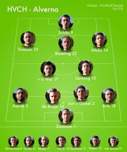 Ook na rust was HVCH de bovenliggende partij, ook nu weer ‘pakte’ de ploeg de meeste ‘tweede ballen’ en kon van daaruit verder. Een verkeerde interpretatie van agressiever spelen leverde Bart Schiks van Alverna na 60 minuten een rode kaart op, met geel op zak ging hij er te wild in op de helft van de tegenstander en kreeg zijn tweede gele kaart. Het werd al snel duidelijk dat het met tien man een hele kluif zou worden om hier een resultaat te halen. Dat het toch nog een punt opleverde was o.a. te danken aan keeper Robert Zaalman, die net als de hele verdediging regelmatig moest ingrijpen. Zijn beste/belangrijkste redding was in blessuretijd, toen hij zich voor een schot wierp en zo redding bracht. Deed Alverna aanvallend nog iets in de tweede helft? In ieder geval niet genoeg om HVCH aan het wankelen te brengen, daarvoor was het vandaag te ‘vleugellam’. Na de wissels van Mbila en Dobson kwamen er in de slotfase nog wat mogelijkheidjes, invaller Danny Meijer kwam een teenlengte te kort om een pass van Sander Bisseling mee te nemen en zo kansrijk te worden. De andere invaller Arthur vd Eeckhout dwong met een vlammend schot doelman Van Nuland tot een redding, en vlak voor tijd kwam een voorzet na een rush van Jari van Ginkel net achter hem. En zo bleef de 1-1 op het ook al haperende scorebord, en daarmee kon Alverna het meest tevreden zijn.