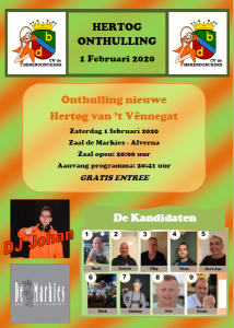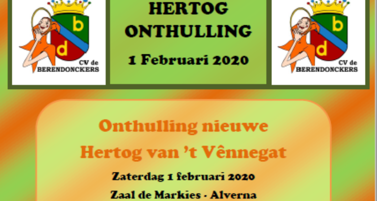 Zaterdag 1 februari zal in Zaal de Markies op Alverna de nieuwe Hertog van ’t Vênnegat worden onthuld tijdens de jaarlijkse Hertogonthulling van carnavalsvereniging de Berendonckers. Ook dit jaar zijn 9 kandidaten gestrikt, waarvan er uiteindelijk 1 overblijft die Hertog Arie opvolgt en komend jaar over ’t Vênnegat zal regeren.
